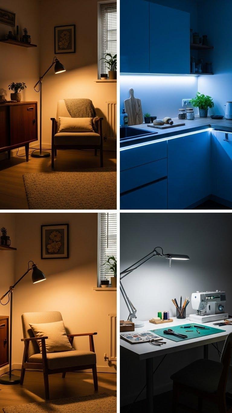 If you want crisp, comfortable work zones, put task lighting exactly where activities happen—over the reading chair, above the kitchen prep area, and beside the hobby table. You’ll choose under cabinet lighting for counters, direct LED fixtures for sewing or crafting, and task specific sconces to focus beams without glare. Place switches within reach so you control light and freedom every moment.