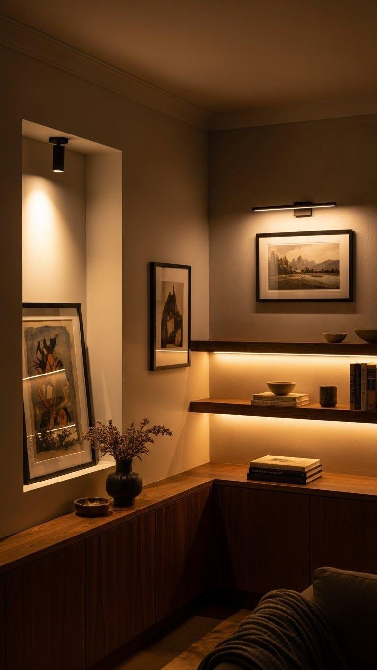 Often, a well-placed accent light makes a room feel curated rather than accidental — use spotlights, picture lights, or LED strips to draw the eye to artwork, architectural details, or a textured wall.
