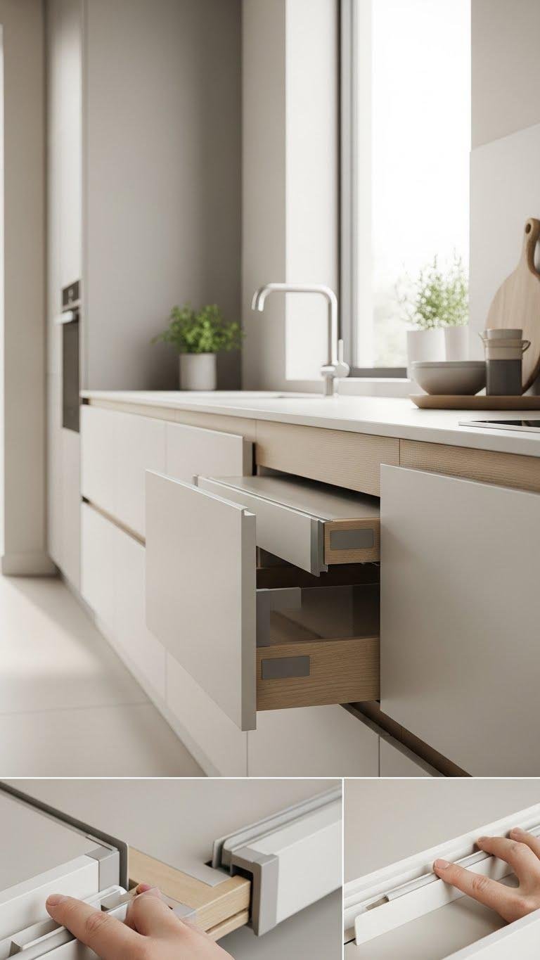 When you skip visible hardware, integrated pulls keep the kitchen’s lines uninterrupted and make every surface read as intentional. You’ll appreciate how recessed finger grooves and a seamless push to open mechanism let drawers and cabinets vanish into the room. The result feels freeing: precise, calm, and tactile. Choose finishes that whisper rather than shout so movement becomes practically invisible and effortless.
