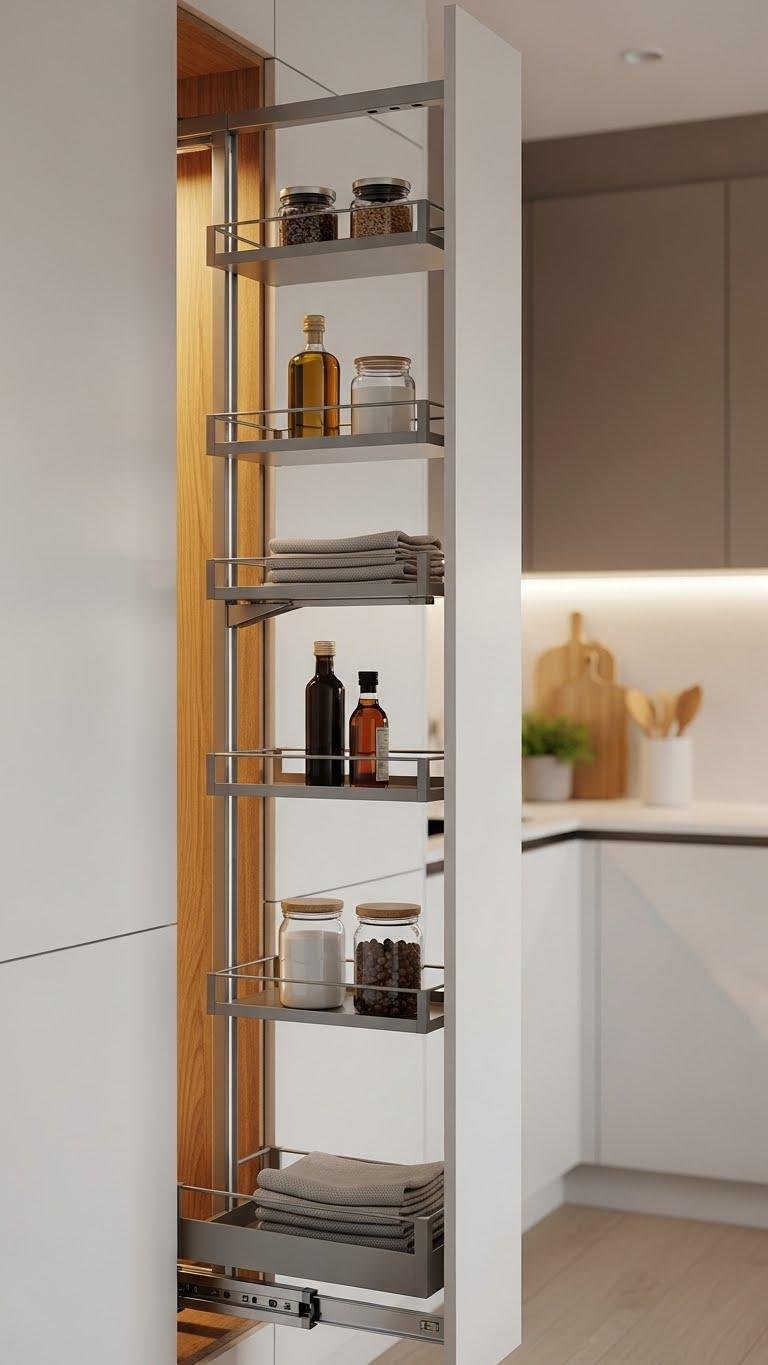 Slide a vertical pull‑out pantry into a narrow gap and you gain a razor‑thin storage solution that makes every inch count.