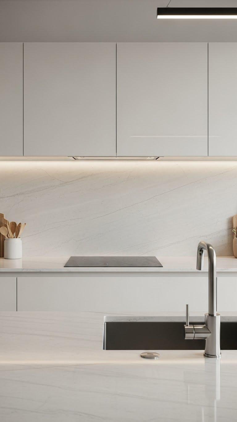 When you run a single large-format slab from countertop to upper cabinets, the result is an uninterrupted, calm surface that visually expands the room and simplifies cleaning. You’ll appreciate the minimalist effect: seamless groutlines that vanish, subtle veining, and a pared-back palette. Consider backlit translucence for mood and depth. The outcome feels orderly, liberating, and intentionally sparse—clean by design.