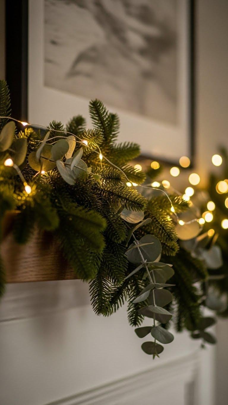 You’ll choose an evergreen garland or minimalist eucalyptus for clean lines, then go fairy lit and twinkle wrapped for subtle glow.