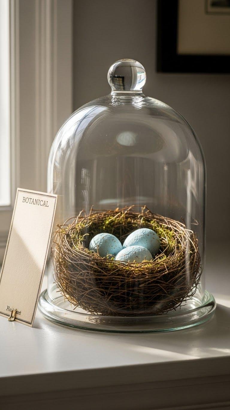 After the gentle charm of postcards and travel trinkets, set a small, arresting scene with a robin’s nest tucked under a glass cloche — it creates a focused, sculptural moment that reads like a found object in a museum.