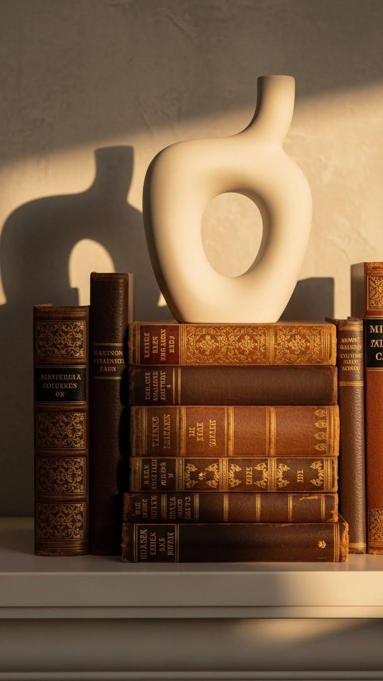 Think of stacked books as a low plinth that instantly elevates a sculptural object and anchors the mantel’s composition. You’ll use antique tomes for texture and history, their worn spines grounding a modern sculptural topper.