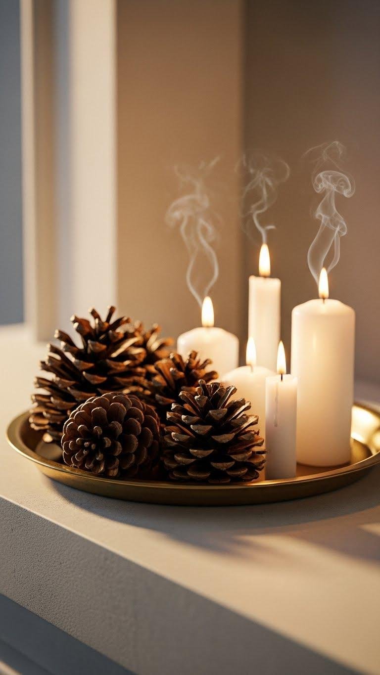 If you loved the calm of a single driftwood sculpture, bring a touch of warmth and seasonal texture by grouping pinecones and white candles on a low-profile brass tray. You’ll anchor the mantel with antique brass shine, natural cones, and clean tapers. Add pine scented candles for subtle aroma; arrange asymmetrically so the display feels effortless, freeing your space without clutter.