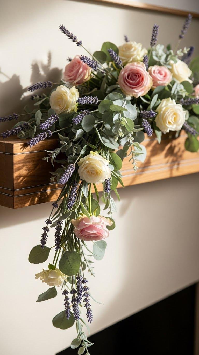 Drape a cascading swag of lavender, roses, and eucalyptus across your mantel to introduce movement and scented elegance; the trailing stems soften edges while the lavender’s muted purple and dusty-green eucalyptus create a refined, calming palette.