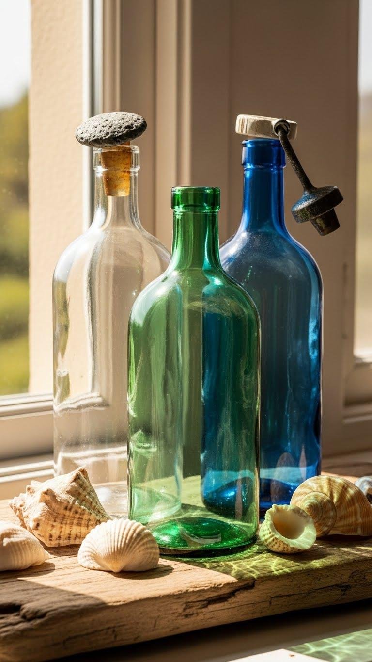 A trio of glass bottles—clear, sea-glass green, and smoked blue—creates instant coastal charm when clustered with a few well-chosen shells; place them at varying heights to catch light and let the shells anchor the composition so it reads intentional, not cluttered. You’ll craft a shell infused coastal vignette using a salvaged stopper, letting weathered patina and negative space speak to your free, confident taste.
