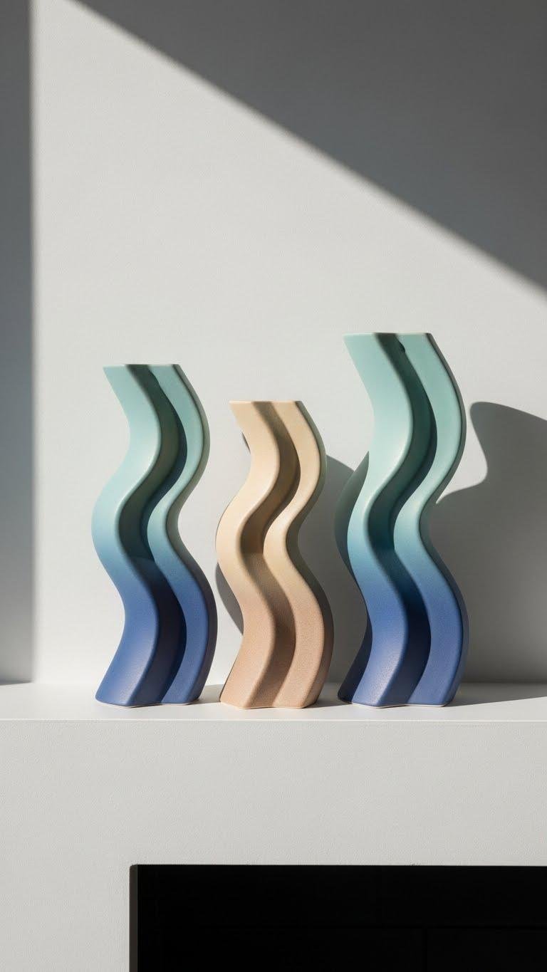 Think of wavy abstract vases as sculptural punctuation for your mantel—curving silhouettes in coordinating hues give you movement without mess. You’ll choose ombre ceramics and coastal hues to echo sky and sea, arranging a trio or pair for balance. Keep negative space, vary heights, and let light highlight contours. The result feels liberated, modern, and effortlessly composed.