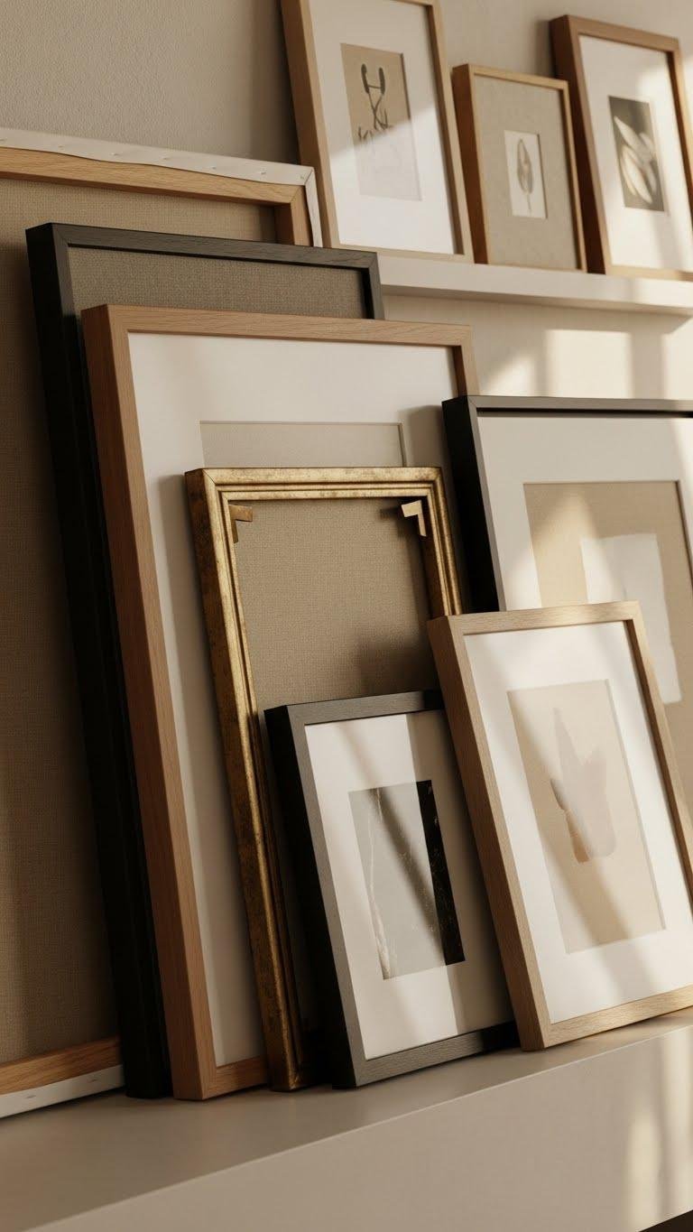 Lean framed art against the wall to create depth and casual polish on your mantel—overlap a few pieces of varying sizes and frames so each layer reads like a deliberate pause. You’ll use gallery ledges to anchor neutral mats and textured frames, arranging overlapping canvases for contrast. Keep compositions relaxed but intentional so your mantel feels liberated, curated, and effortlessly yours.