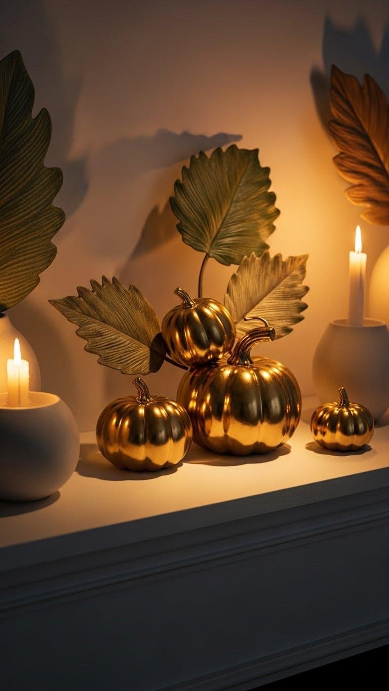 Paint a touch of autumnal glamour across your mantel with a small cluster of gilded pumpkins paired with sculpted faux foliage—it’s an instant way to elevate seasonal decor without the maintenance. You’ll place gilded clusters asymmetrically, letting metallic shine anchor the composition. Pair with matte objects and simple candles; faux foliage adds texture and freedom from upkeep while keeping the look refined and modern.