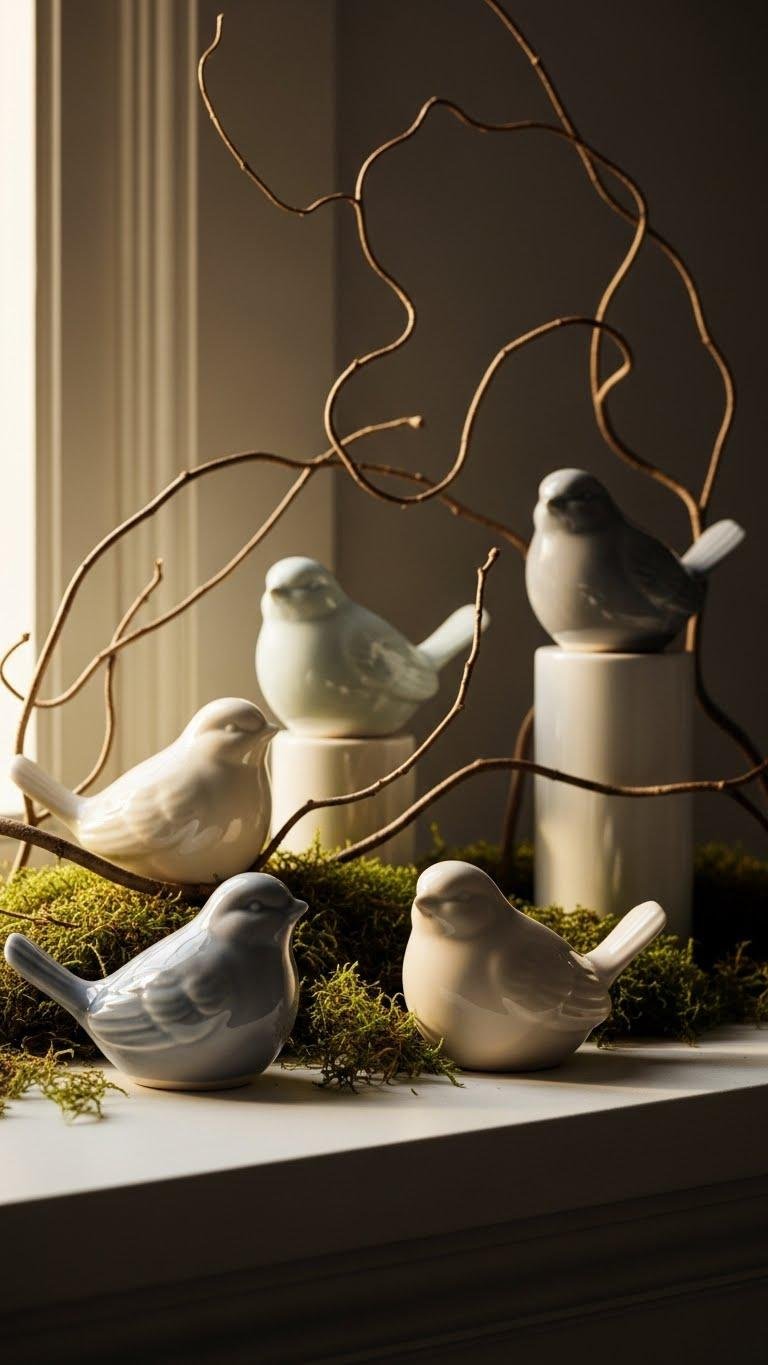 After the gleam of gilded pumpkins, bring a softer, nature-inspired note to your mantel with ceramic bird figurines nestled among moss and slender branches. You’ll craft a ceramic birdscape that feels personal and free—place varied heights, tuck mossy branchwork around feet, and leave negative space. The result’s elegant, breathing decor that invites movement and quiet, confident simplicity year-round.