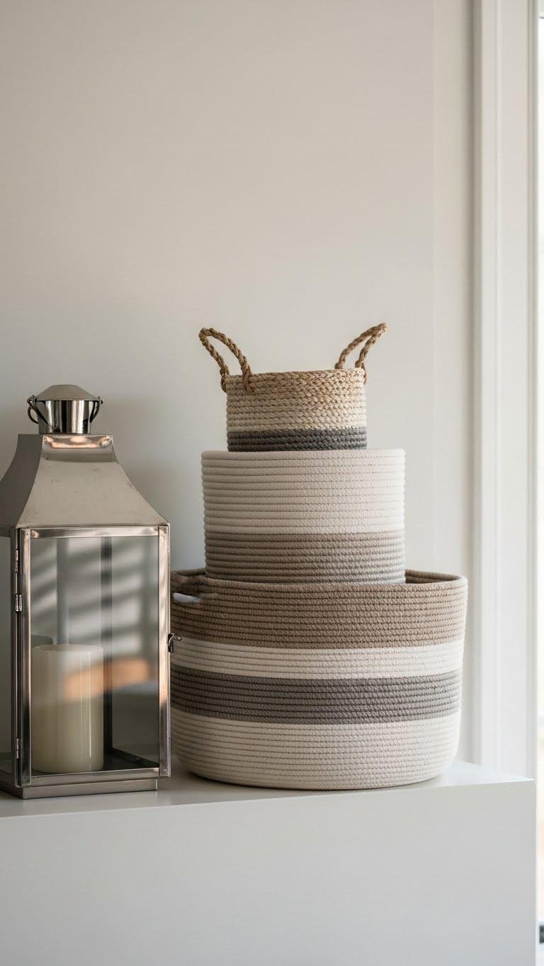 Pair two or three neutral woven baskets of varying sizes and textures to anchor a lantern and give your mantel grounded, purposeful weight.