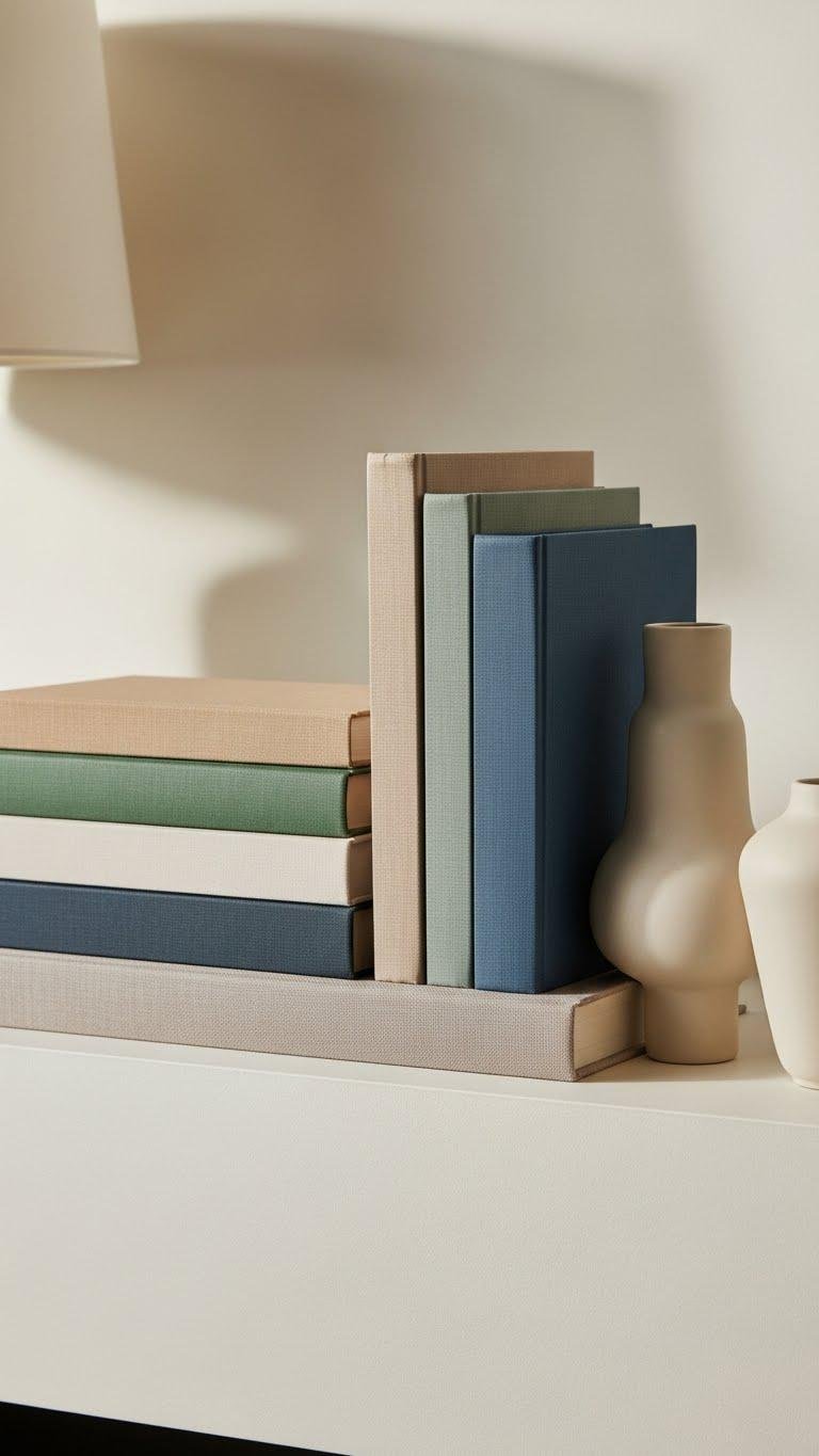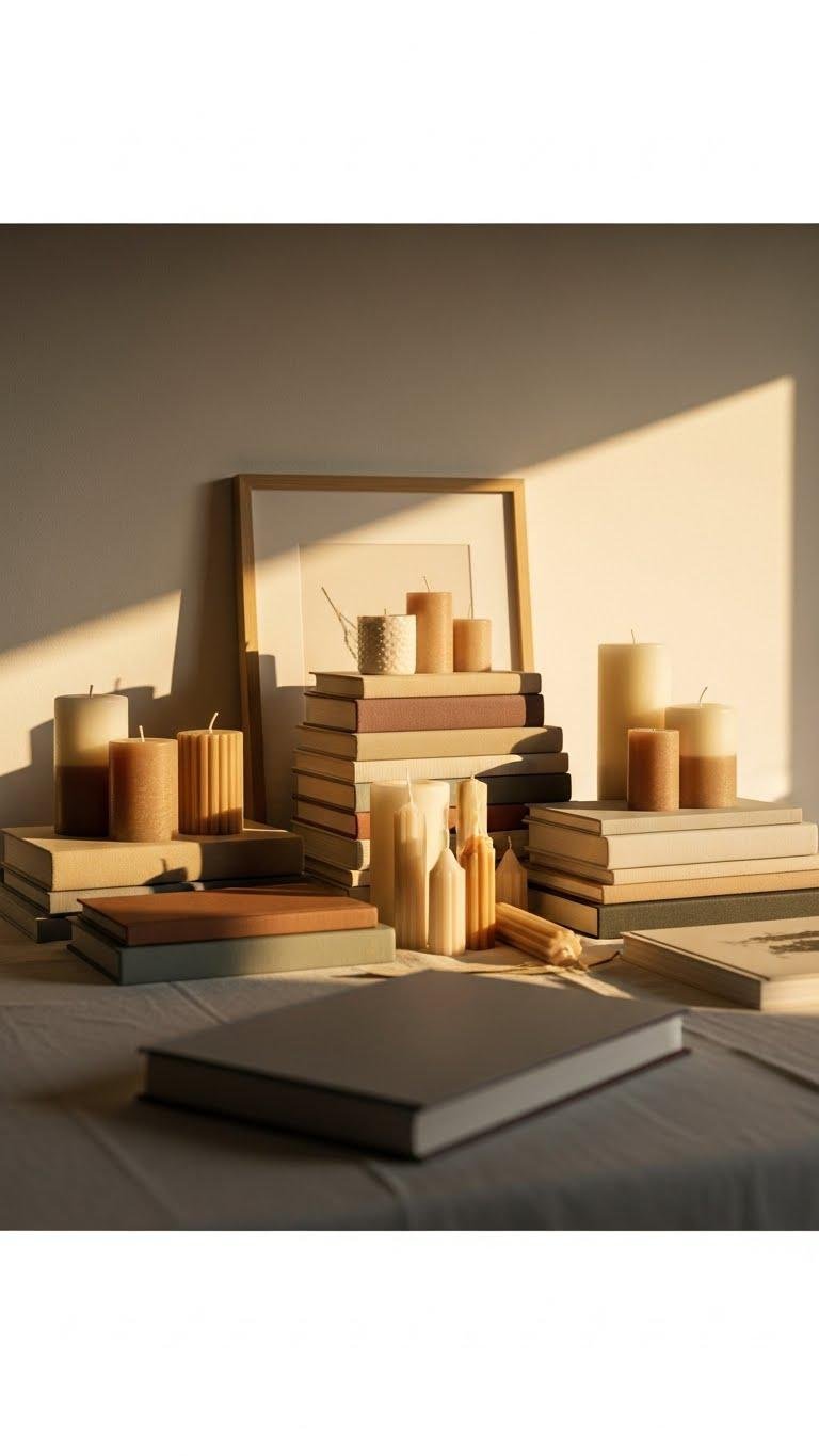 After the vertical drama of a tall vase, bring the eye back down with a balanced asymmetrical arrangement using books and candles—it’s about composed informality. You’ll layer low book stacks at varying heights, anchor with candle clusters, and leave negative space for ease. Mix textures and sizes, lean one framed print slightly, and trust instinct; freedom here means bold restraint that feels effortless every season.