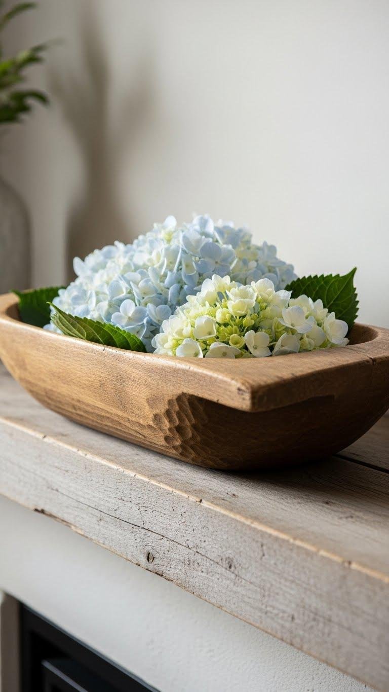 Often a single sculptural piece, a dough bowl centerpiece makes hydrangeas feel effortlessly collected and natural.