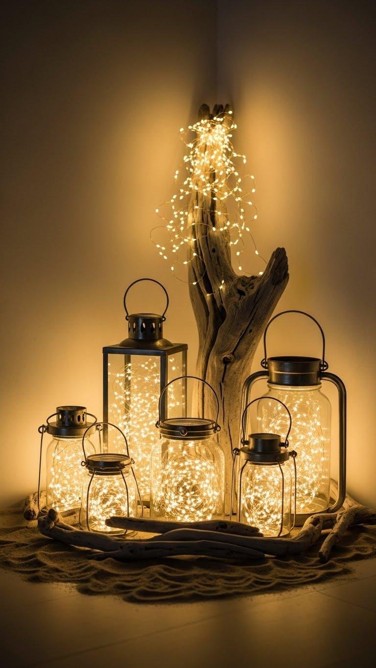 Bring warmth to your mantel by arranging a cluster of lanterns wrapped in delicate fairy lights and anchored with a piece of weathered driftwood. You’ll create a beachy centerpiece that feels effortless and untethered. Let the lights form a twinkle canopy above the wood, casting soft, wanderlust-inspiring glow. Position lanterns asymmetrically for movement, embrace negative space, and keep the look clean and liberated.