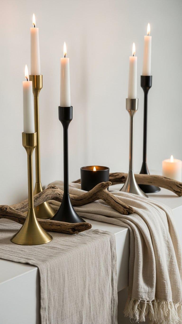 If you loved the soft glow of lanterns and driftwood, swap in mixed-metal candle holders to introduce structure and contrast while keeping that relaxed, coastal vibe. You’ll layer brass, blackened steel and brushed nickel against neutral textiles — linen runners, cotton throws — for tactile calm.