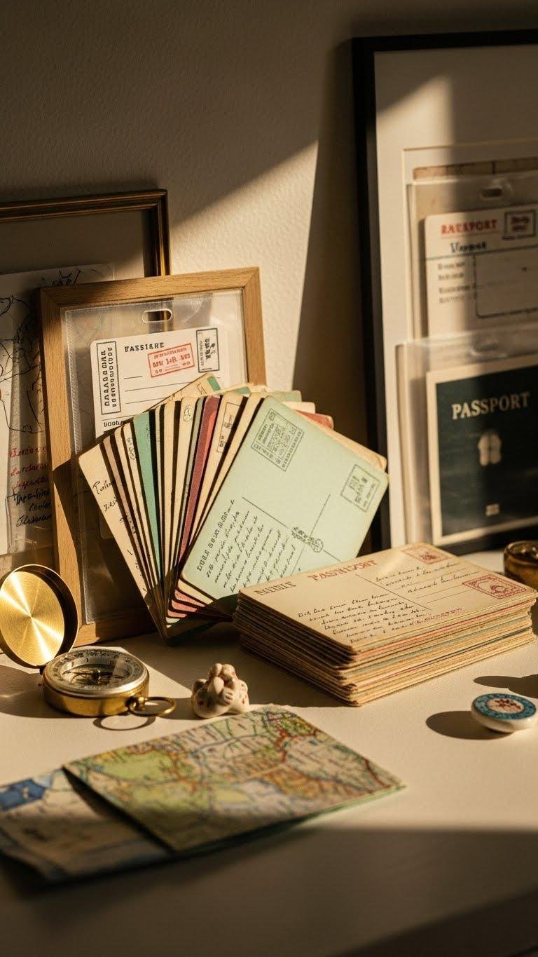 Layer a small stack of weathered postcards with a scattering of travel trinkets to create a shelf vignette that feels curated, personal, and effortlessly collected. You’ll balance postcard preservation with bold display: use acid-free sleeves, simple frames, and rotating groupings. Practice souvenir curation by editing pieces for scale and story. Keep it airy, confident, and liberating — your mantel, your journey.