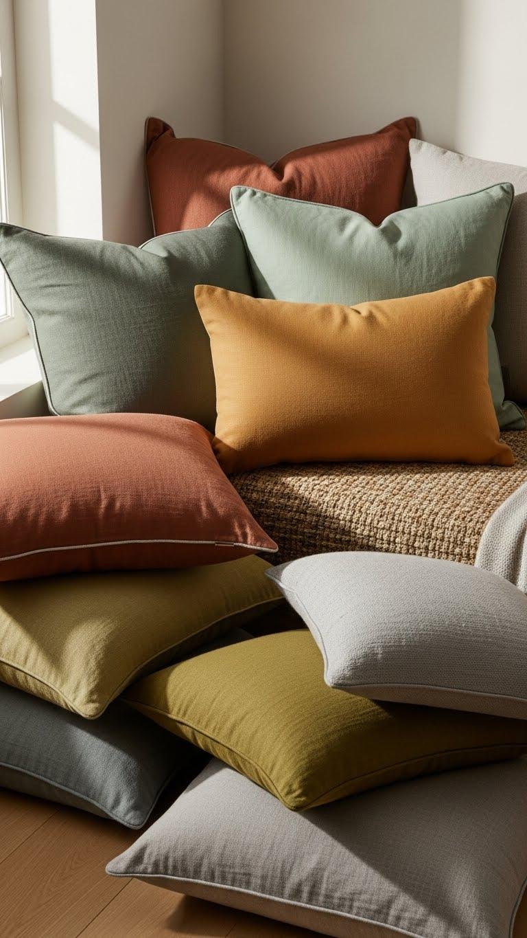 A few carefully chosen cushions in muted earth tones can quietly lift a room’s mood without stealing the show; pick shades like clay, sage, ochre, and stone to add warmth and cohesion to a neutral palette.