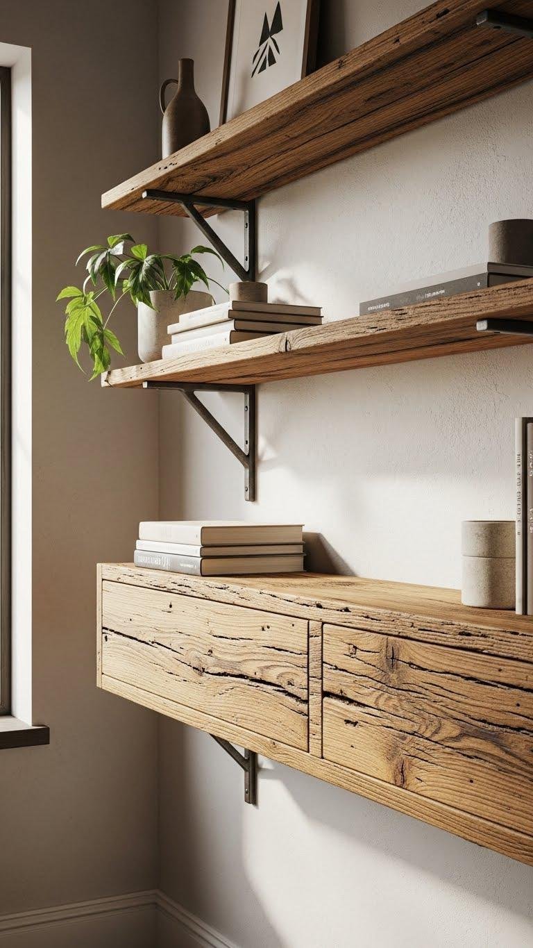 While reclaimed wood brings character and history into your space, choose pieces that balance patina with structural soundness so your shelving looks intentional and lasts.