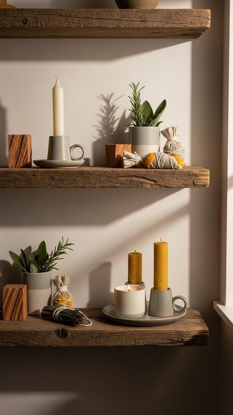 Pairing reclaimed wood shelving with subtle scenting keeps your space cohesive and calm; natural candles add aroma without stealing attention from the room’s quiet lines. You’ll choose soy or beeswax candles scented mildly with citrus zest or herb sachets you assemble after seasonal foraging. Place candles near cedar blocks to anchor scent, rotate fragrances, and let fragrance imply personality without cluttering surfaces or schedule.