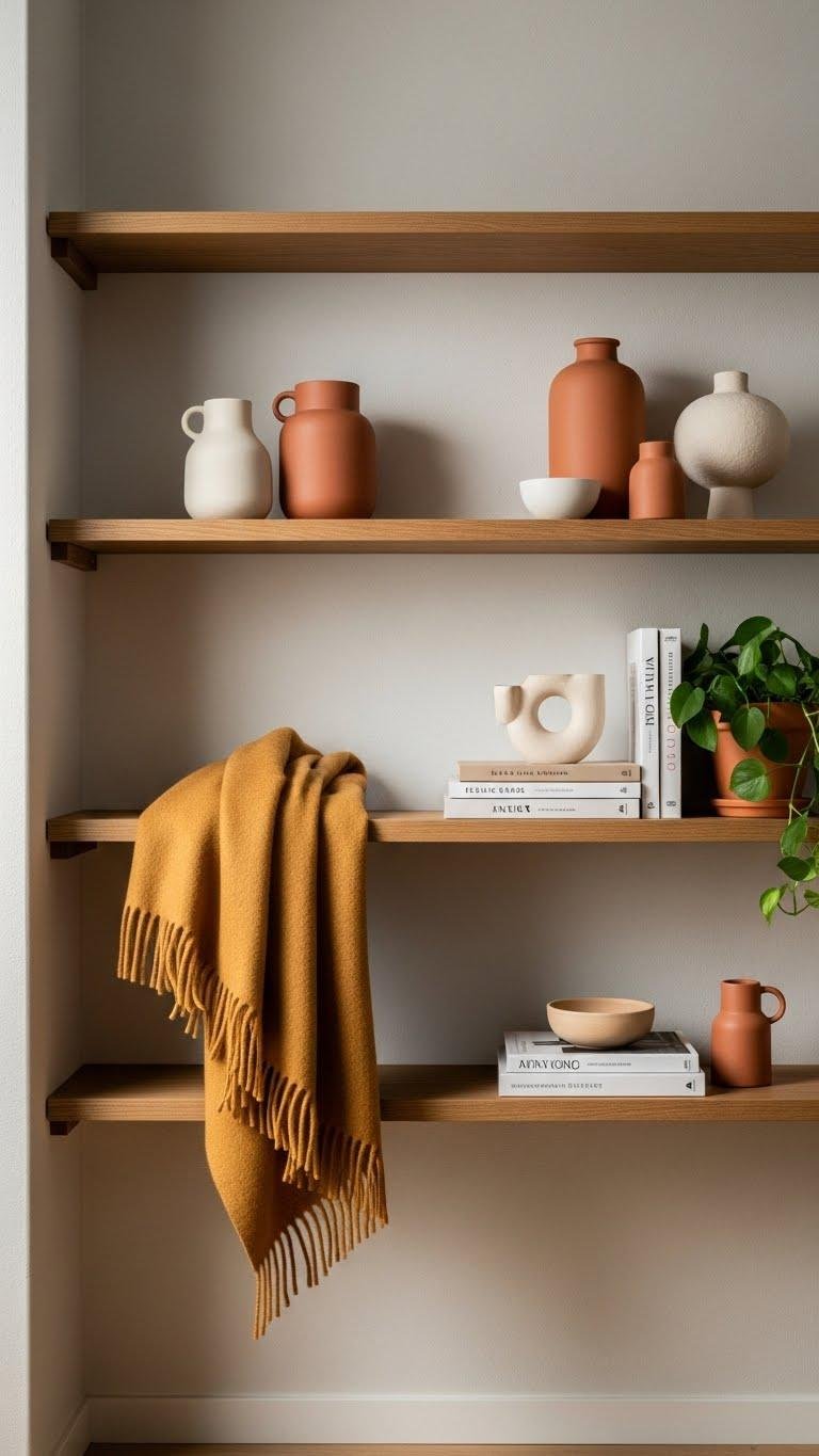 Bringing tactile warmth from a wool throw into the rest of the room calls for similarly considered shelving: open shelves let your curated objects breathe and reinforce that lived-in, uncluttered feel.