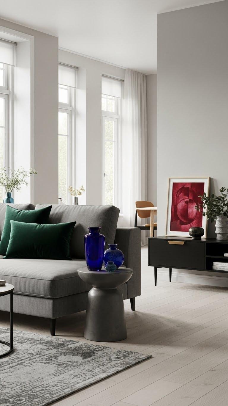 When you introduce rich jewel tones in small doses, they give a modern apartment depth and personality without overwhelming the space.