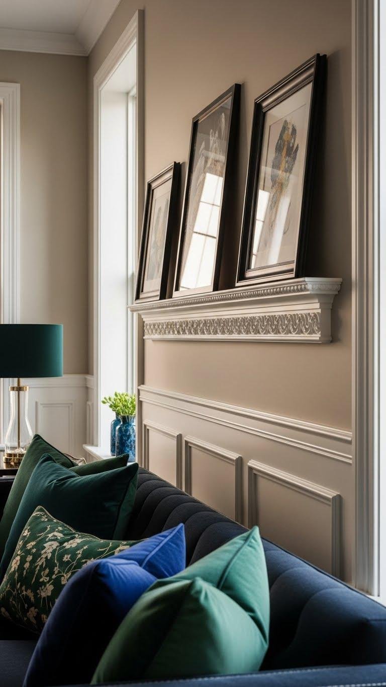 After you’ve let jewel tones punctuate a neutral palette, add decorative architectural trim to give the room a sense of permanence and tailored detail. You’ll choose an ornate picture rail to float art without damage, or install beadboard wainscoting for tactile warmth and scale. These trims anchor your space, feel deliberate, and let you rearrange freely while keeping a refined, lived-in look.