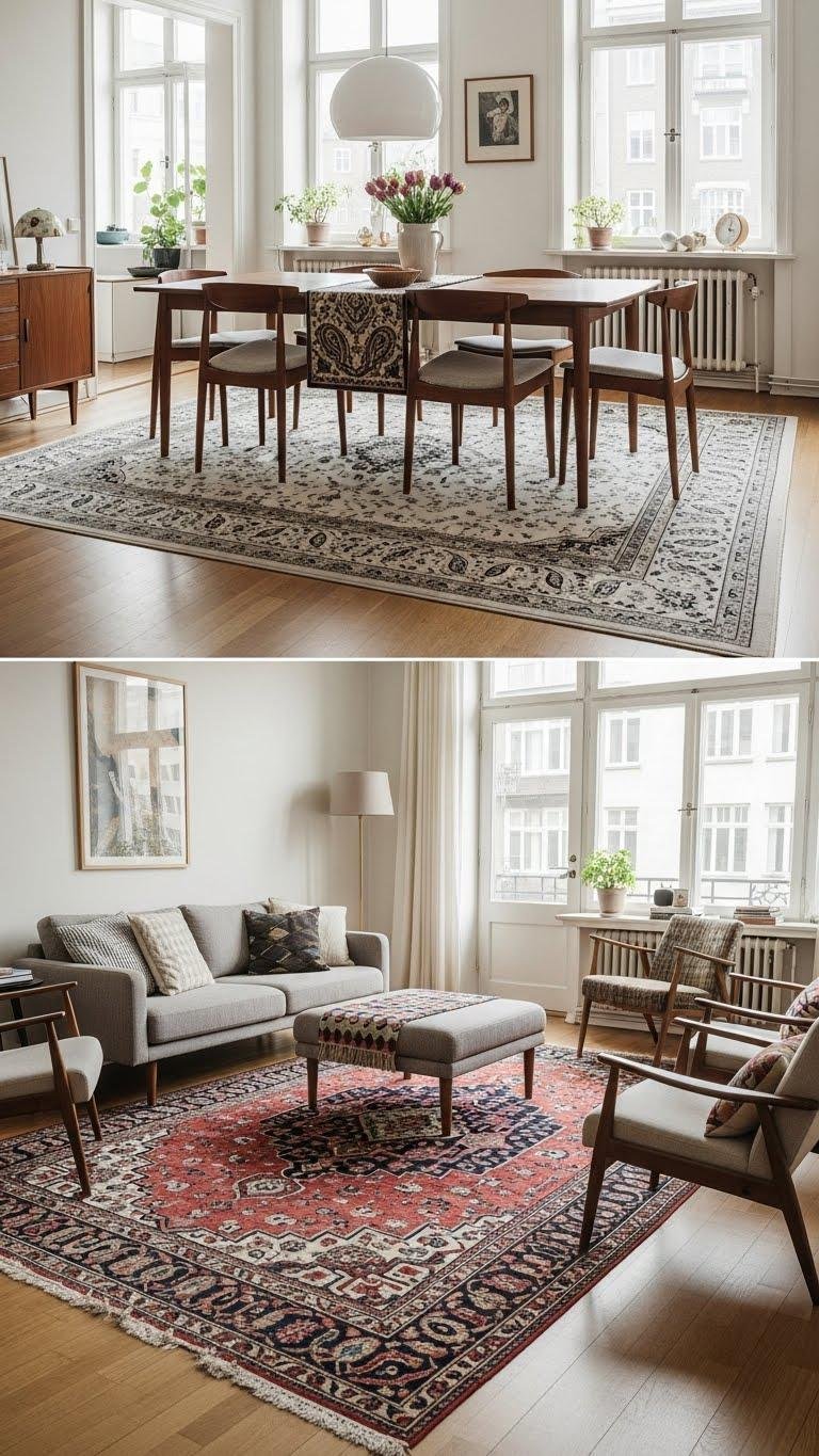 Pairing rugs is one of the smartest moves you can make to define zones in an open-plan apartment without adding walls.