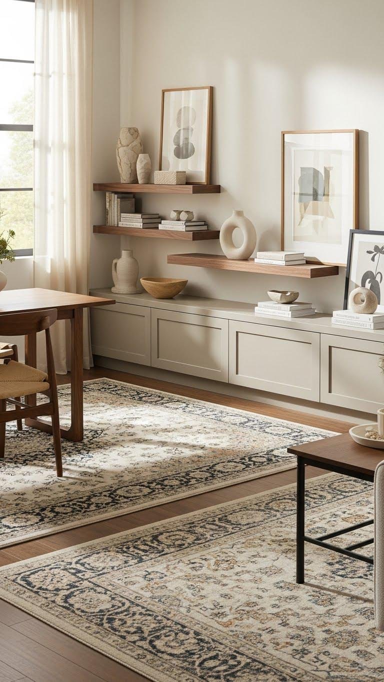 Layering rugs to carve out living and dining areas gives you defined zones—now make those areas feel finished by building in style without touching a wall. Use floating ledges staggered at eye level, pair with low faux cabinetry to suggest permanence, and add curated objects to anchor sightlines. You’ll gain built-in impact, swap pieces easily, and keep rental freedom intact.
