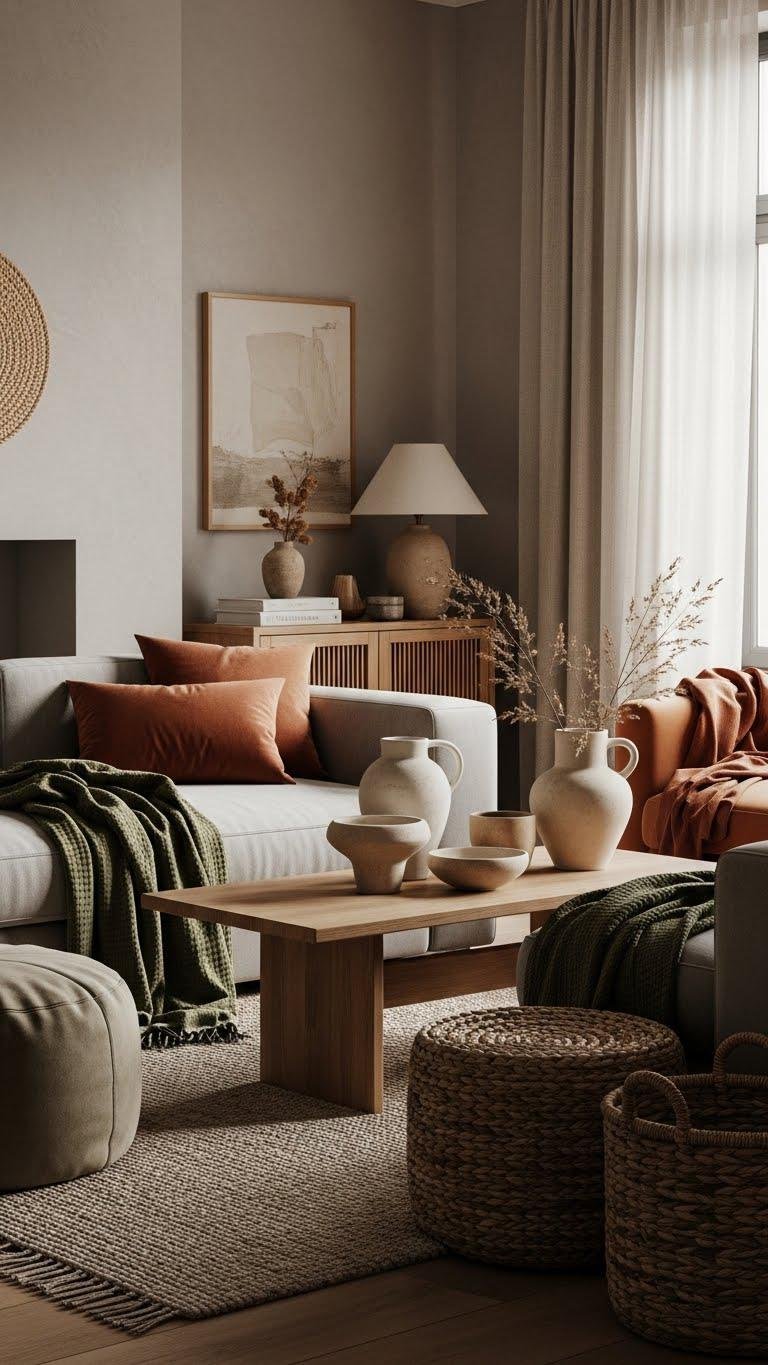 When you layer warm neutrals—terracotta, olive, ochre, and warm grays—your living room instantly feels grounded and inviting; these earthy tones create a cohesive backdrop that highlights texture and natural materials. You’ll lean into terracotta accents and moss textiles to anchor furniture, introduce sculptural ceramics, and let light play. The result’s a liberated, calm space that feels modern, textured, and effortlessly lived-in.