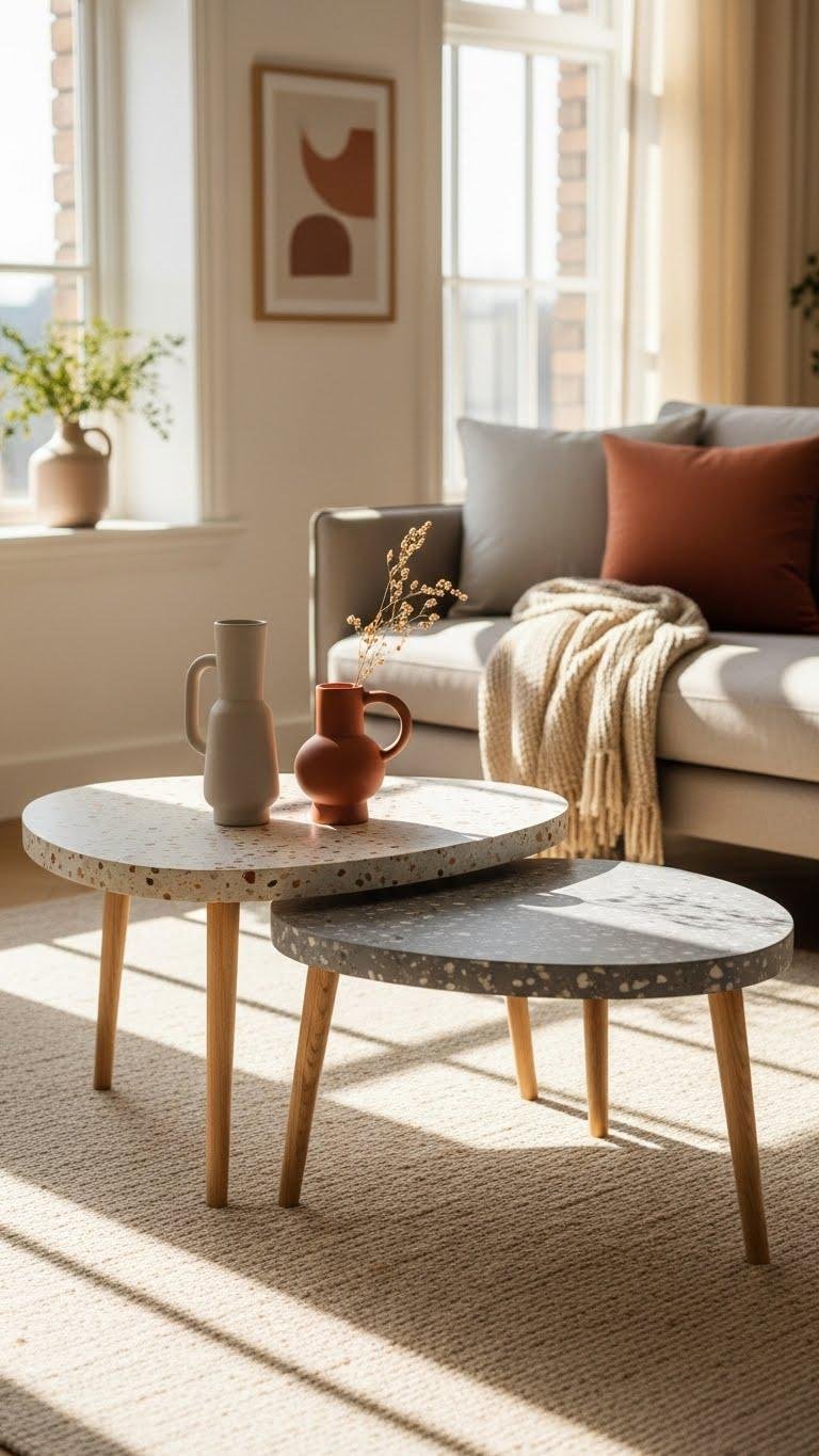 Swap in rounded coffee and side tables to immediately temper sharp room lines and make corners feel welcoming. Choose round edged surfaces and terrazzo tops for tactile charm, pairing nesting tables to adapt scale and function. You’ll like tapered legs for a light, airy profile that keeps flow open. These choices soften visual angles, invite movement, and let your space feel freer and more relaxed.