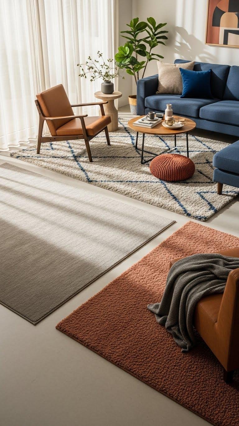 Because layered rugs create instant structure and softness, they’re one of the easiest ways to define zones and add comfort without remodeling. You can use rug anchoring—place a smaller, patterned rug under seating, larger neutral beneath—to visually separate lounge and traffic areas.
