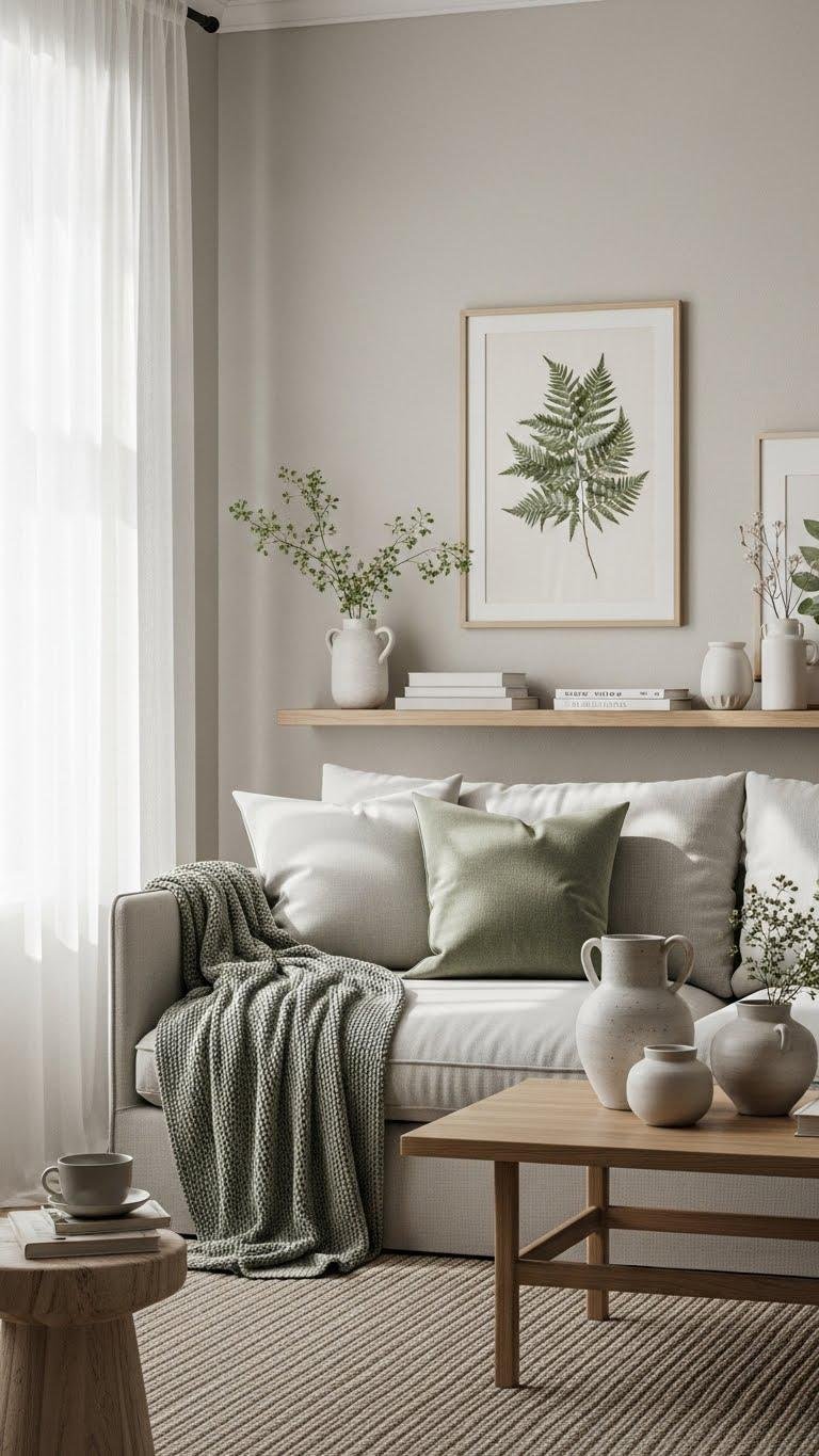 A few well-chosen sage and muted green accents will quietly refresh your living room without overpowering its calm neutral palette.
