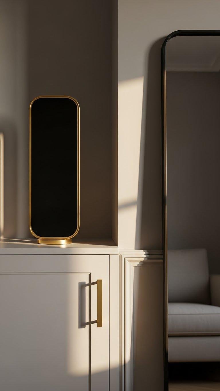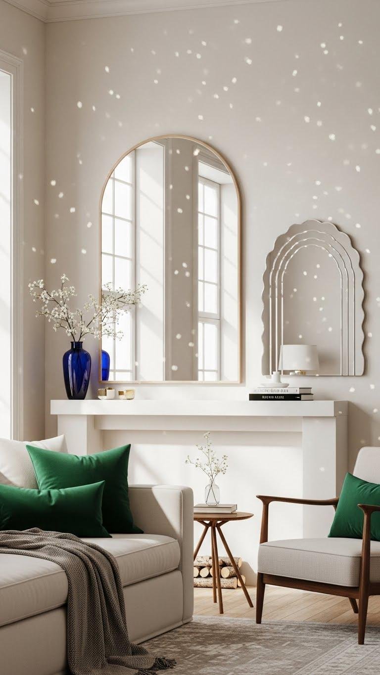 Pairing scalloped or arched mirrors with your neutral, jewel-accented scheme instantly elevates the room’s refinement while keeping the look fresh and airy. Choose arched frames to introduce soft architecture and scalloped reflections to scatter light with gentle patterning. Hang them thoughtfully to create balance, reflect artful accents, and expand sightlines—giving your living room elegant personality without feeling ornate or constrained.