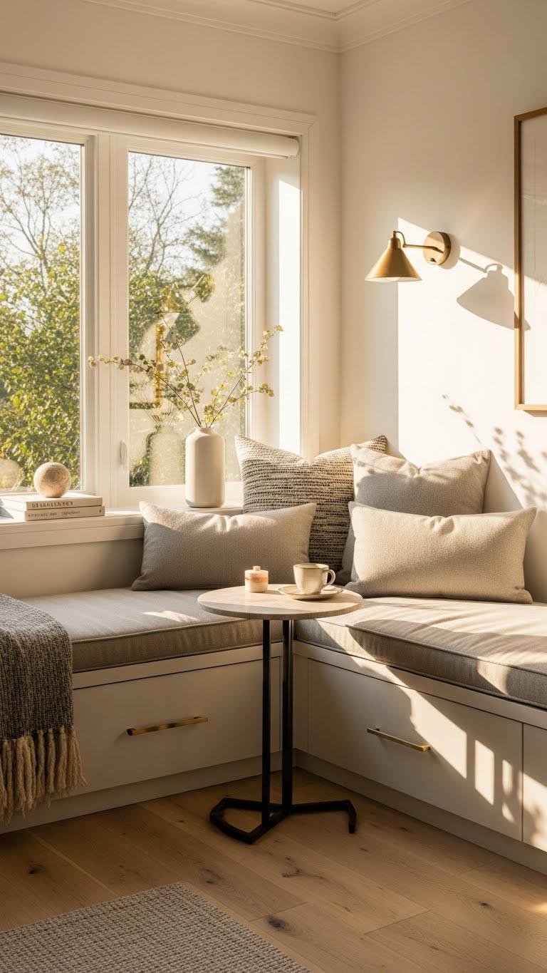 After letting a few gold accents quietly lift a room, bring the same restrained confidence to seating with a built-in banquette that creates an instant cozy nook. You’ll gain a practical, liberated spot for lounging or breakfast without crowding the floorplan. Choose streamlined cushions, hidden storage, and a low-profile window seat to keep lines clean, light flowing, and your space feeling open.