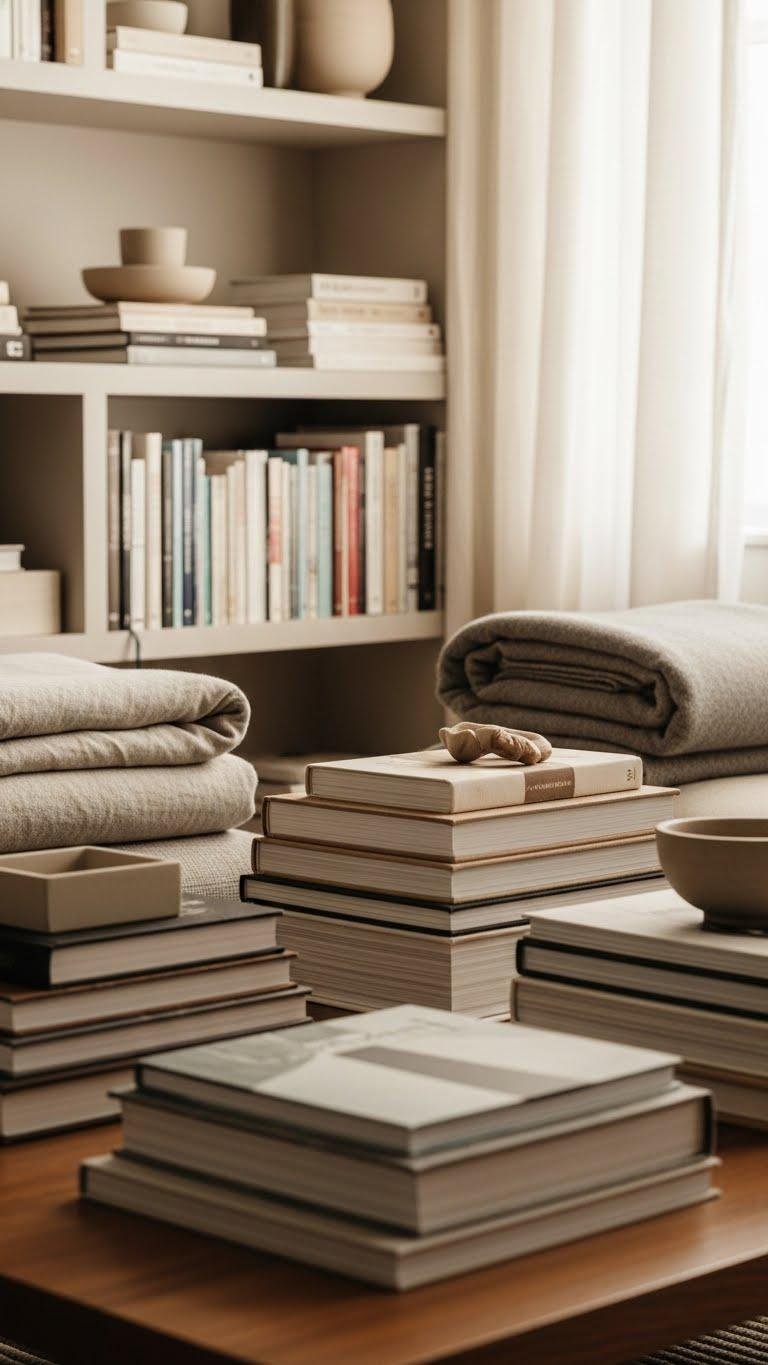 Layer curated books and textiles to make your living room feel lived-in and thoughtfully edited. Arrange stacked spines by color or theme on open shelves and low tables, pairing them with folded throws in natural tones. You’ll create inviting vignettes that suggest use, freedom, and calm. Rotate titles and textures seasonally to keep the room personal and effortlessly relaxed.