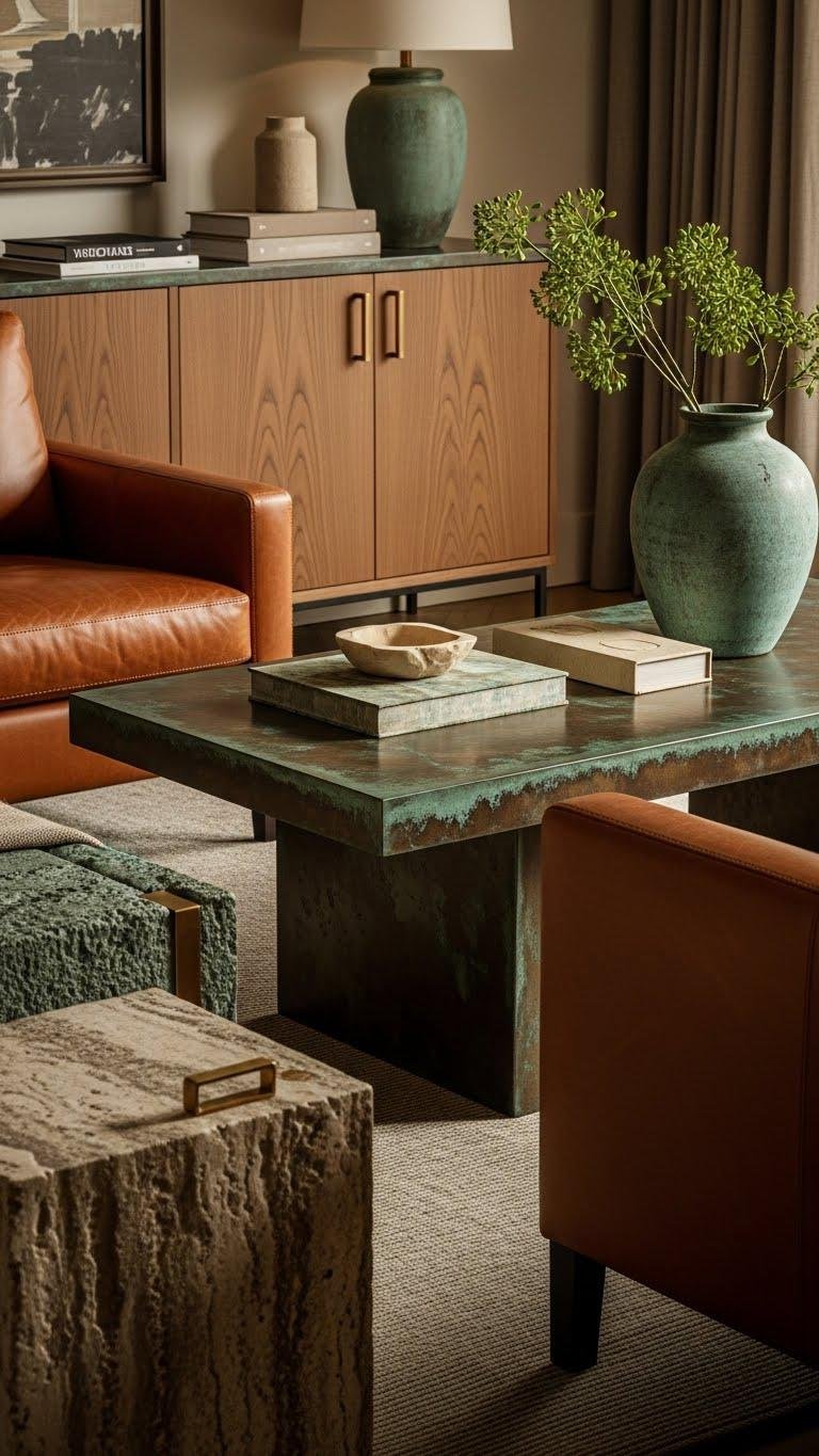 Choose oxidized finishes for coffee tables or small accents to suggest history without heaviness, letting surfaces age gracefully while you enjoy a relaxed, liberated space.