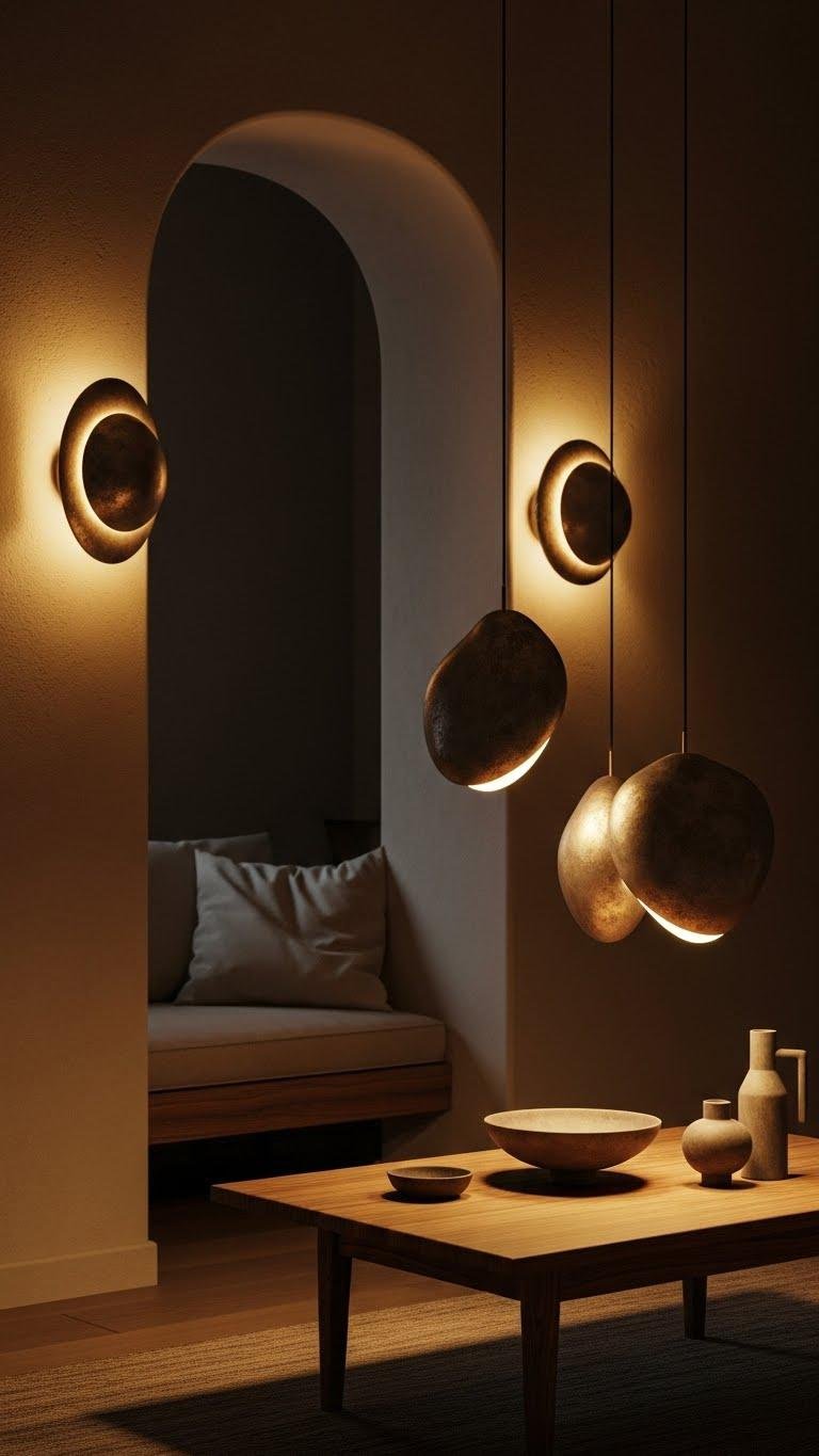 Patinated metals and warm woods set a tactile foundation; now bring that richness higher by choosing sculpted lighting that reads like functional art. You’ll favor sculptural sconces to frame seating and cast layered shadows, and organic pendants to float above coffee tables.