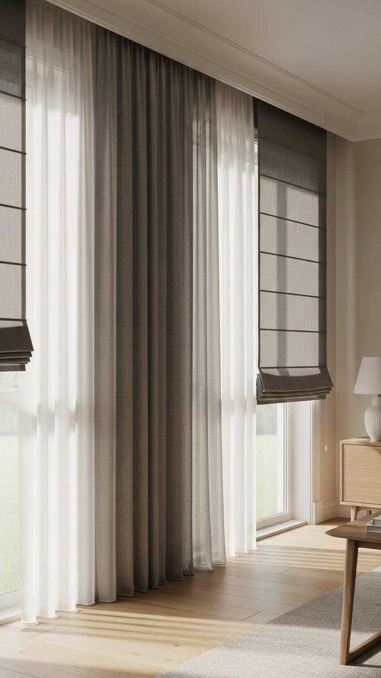 Soften incoming light and gain precise control by layering treatments—combine a sheer for diffuse daylight, a mid-weight drape for privacy and texture, and heavier-lined panels or a blackout roller for night and media viewing. You’ll use sheer overlays to float light softly, add layered valances for architectural polish, and mix fabrics so you control mood, glare, and privacy while keeping the room airy and liberated.