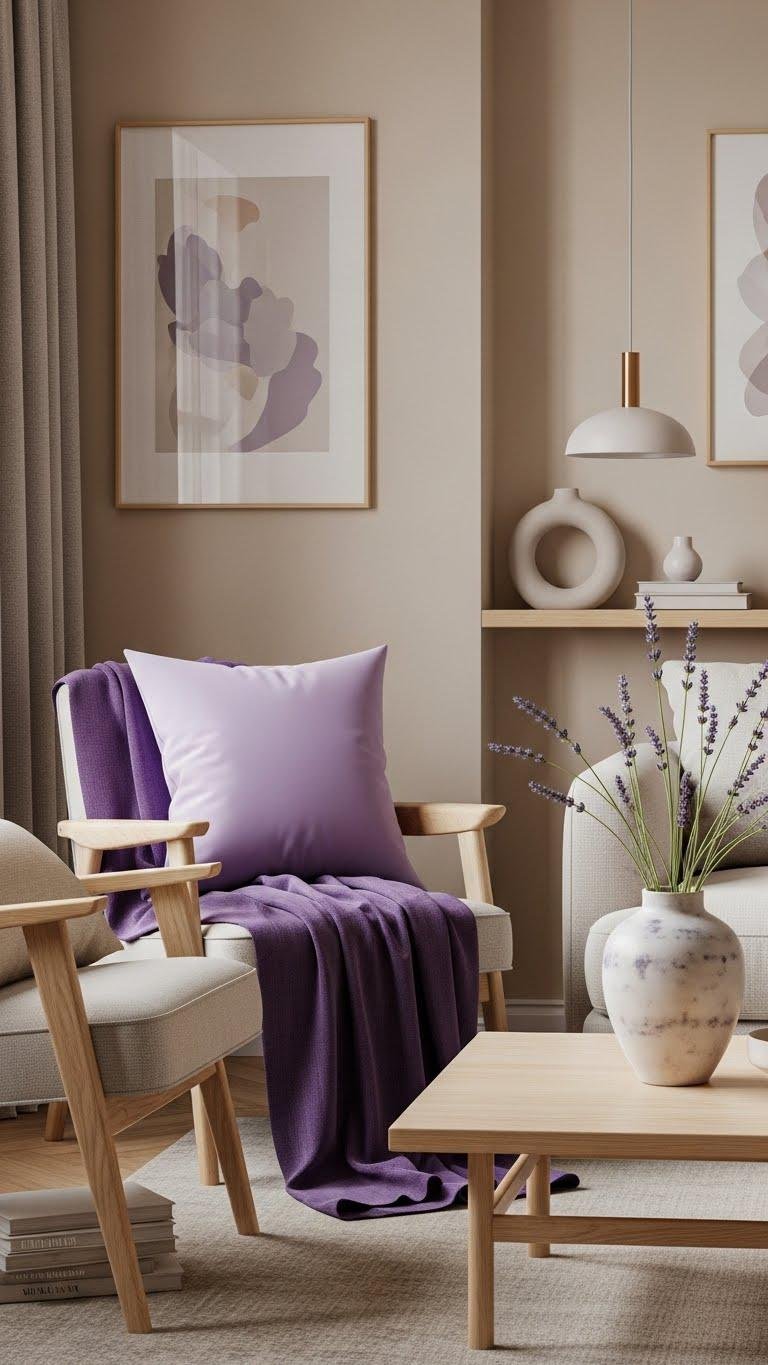 When you introduce touches of lavender or soft purple, the room instantly feels calmer and more cultivated; these hues act as a subtle counterpoint to warm neutrals without overpowering them.