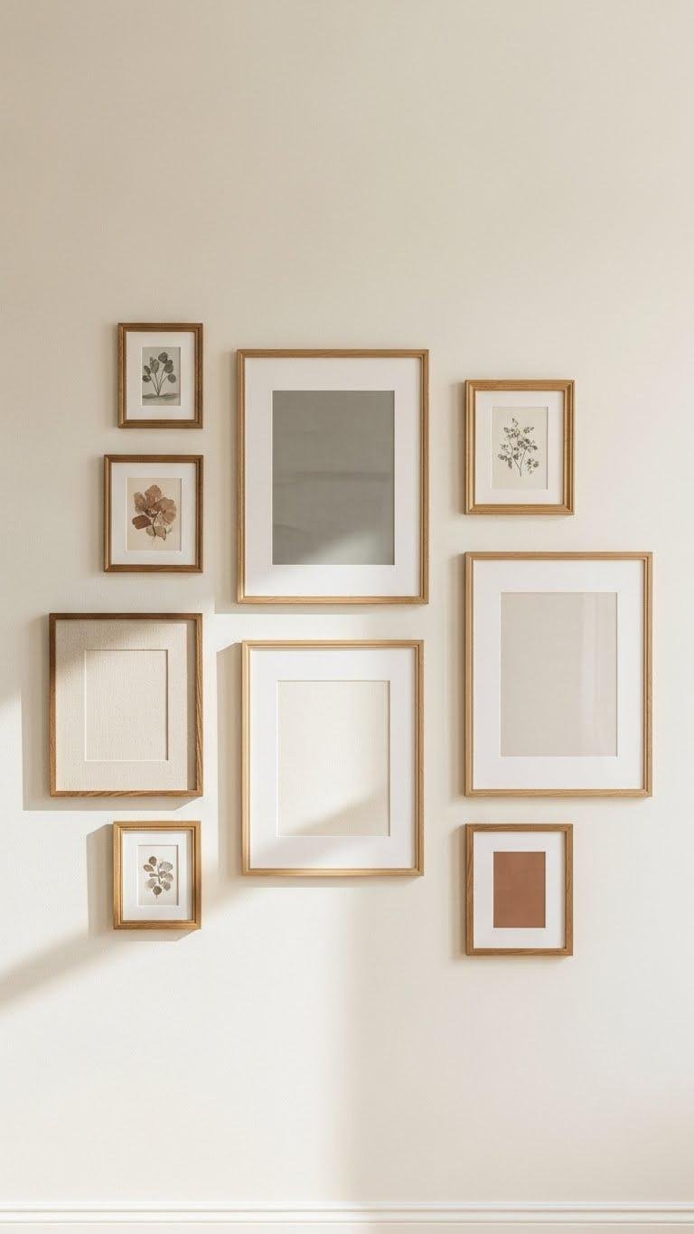 While you arrange pieces for a gallery wall, choose organic frames and a restrained palette to keep the composition serene and cohesive.