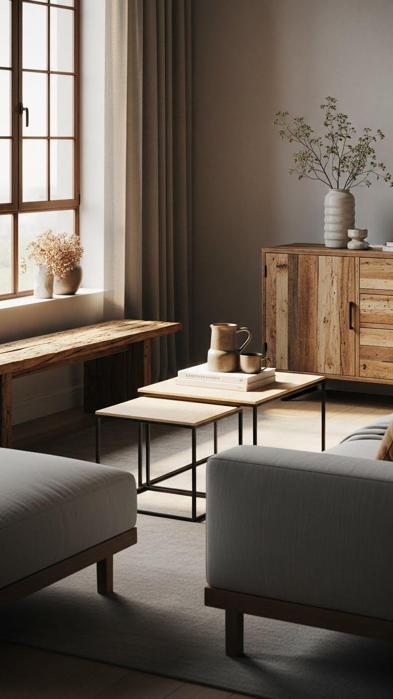 With a few well-chosen pieces, patinated metals and natural finishes bring depth and lived-in elegance to a modern living room.