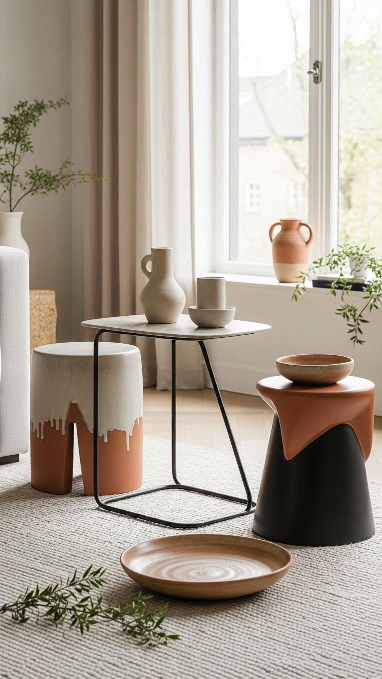 Introduce sculptural pieces that double as furniture or storage to make every object earn its place visually and functionally. You’ll choose functional sculptures that define space without heaviness, blending sleek metal forms with warm tactile ceramics for contrast. Let each piece serve a purpose—side tables, sculpted stools, or pottery trays—so your living room feels liberated, intentional, and artful without sacrificing comfort.