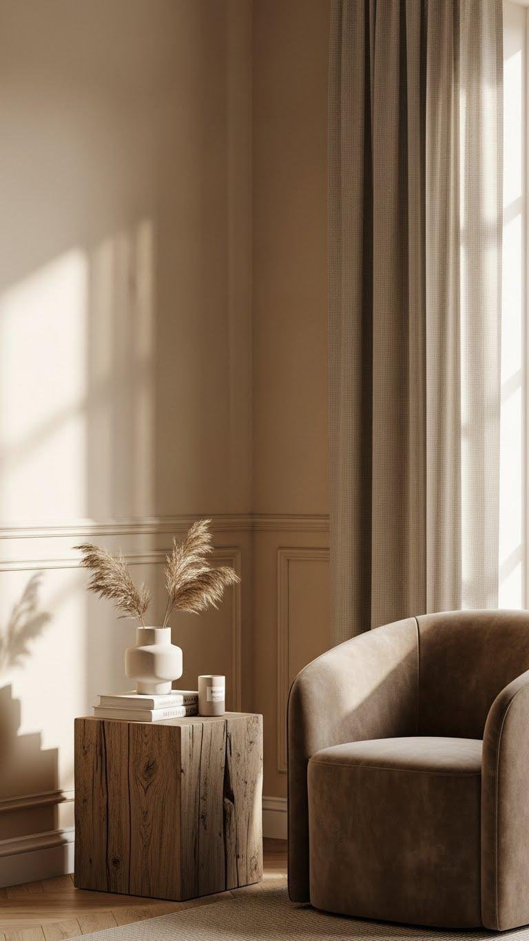 Start with a warm beige on the walls and layer creams, taupes, and linen textures to build an inviting base. Add tactile contrast—velvet cushions, a rust or mustard sofa, terracotta bowls, and a live-edge coffee table—to create depth without clutter. Use layered lighting, muted-blue accents, and grouped ceramics to keep things calm and collected, then try a few simple swaps that will change the whole room.