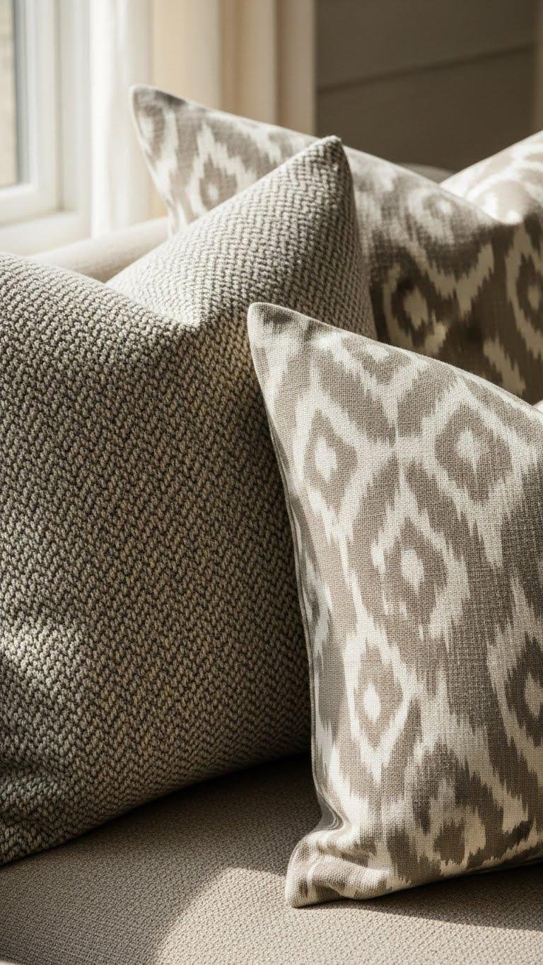 Pillows in taupe and beige instantly calm a room, so swap louder prints for patterned covers that read as texture rather than color.