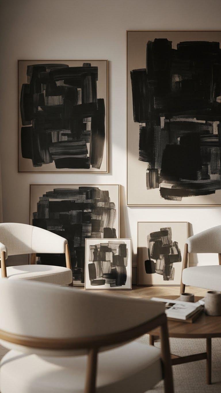With the ivory chairs setting a soft, tactile stage, introduce charcoal and taupe abstract art to sharpen visual rhythm and ground the palette. You’ll balance charcoal taupe strokes with lighter washes, creating abstract contrast that reads modern yet warm. Choose canvases showing layered textures and intentional tonal interplay so your space feels liberated, material-rich, and quietly directional without overpowering the room.