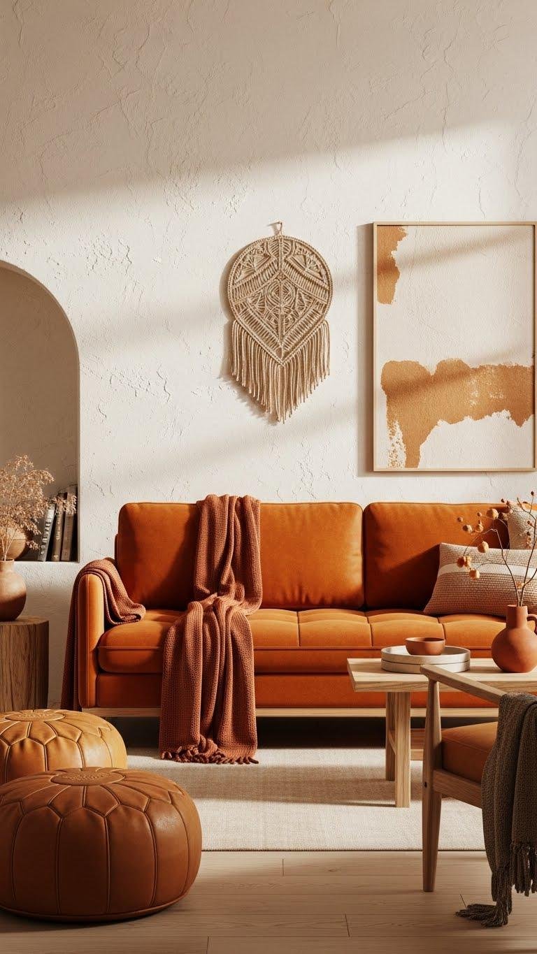 You’ll choose durable woven or leather upholstery that patinas with use, pair it with terracotta throws for depth and tactile contrast, and balance seating with ochre poufs to keep the room open, inviting, and effortlessly free.