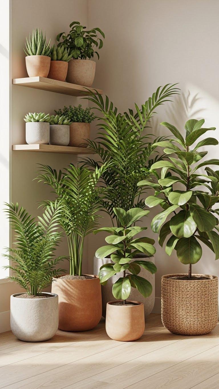 Bring in living greenery set in warm-toned planters to soften the room’s edges and tie the neutral palette together. You’ll choose textures—terracotta, matte stone, woven fiber—for planter warmth while mixing heights and leaf shapes.