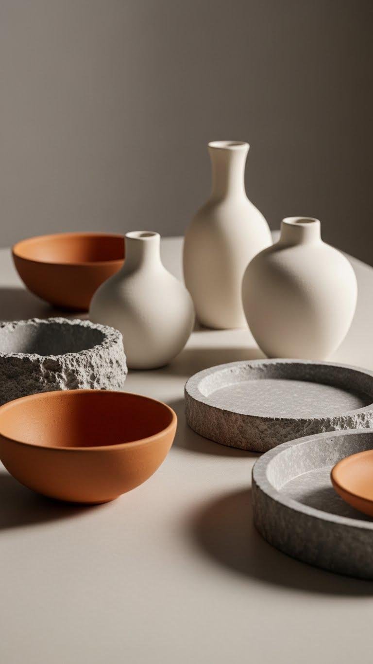 You’ll choose terra cotta bowls, matte porcelain vases, and carved stone trays that age gracefully. Place them sparingly to keep air and movement; mix heights and raw textures to catch light.