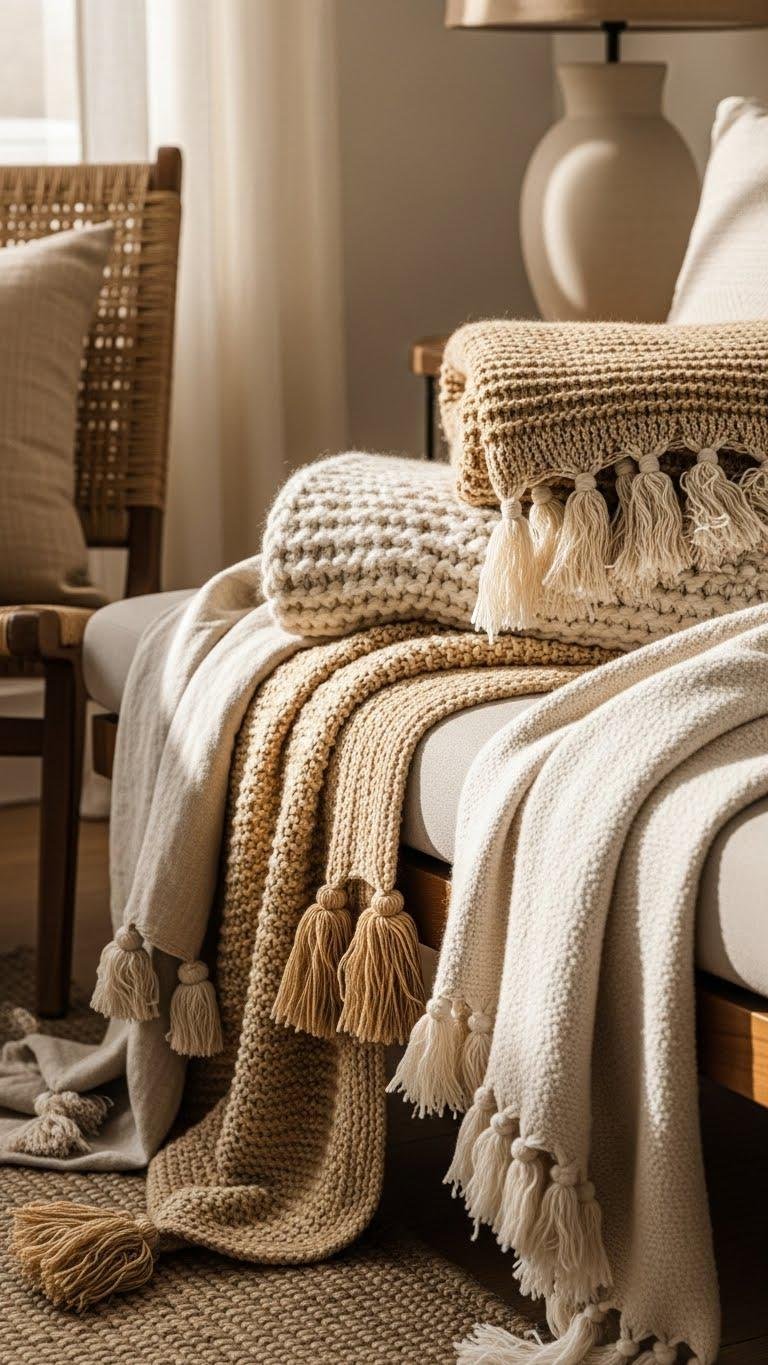 After anchoring surfaces with stone and clay, bring that grounded feel into seating with throw blankets in warm neutrals. Layer lightweight linen, chunky wool, and plush cotton for depth. Choose textured throws to add tactile contrast and subtle pattern; keep colors sandy, ochre, and cream. Finish casually with tassel trims or raw edges so your space stays relaxed, intentional, and free.
